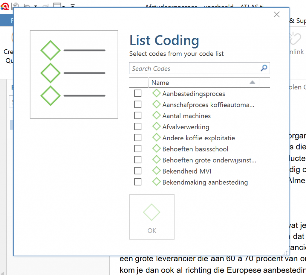 Klik op het tekstfragment met de rechtermuisknop. Selecteer ‘Open Coding’ wanneer je een nieuwe code wilt toevoegen. Selecteer ‘List Coding’ wanneer je gebruik wilt maken van een bestaande code.