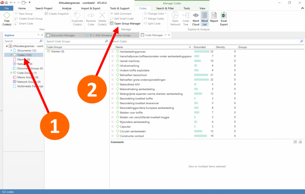 In dit voorbeeld zijn er 122 individuele codes gebruikt. Nadat je alle documenten hebt gecodeerd, ga je kijken welke codes bij elkaar horen. Deze codes verzamelen we in een groepscode.