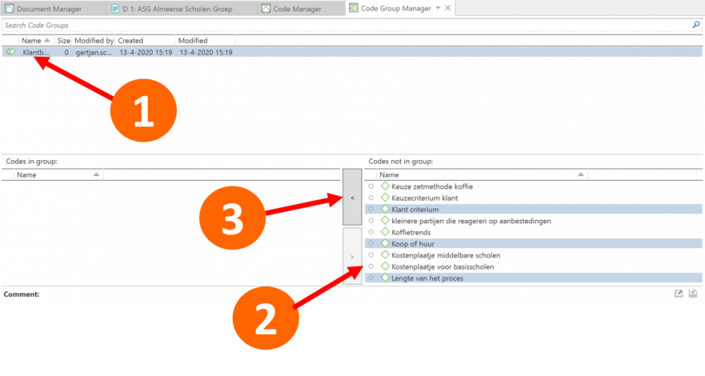 We zien linksboven de groepscode ‘Klantbehoeften’ geselecteerd [1]. Aan deze geselecteerde groepscode voegen individuele code toe. Later kan je aan een groepscode via deze werkwijze altijd nog een code toevoegen.