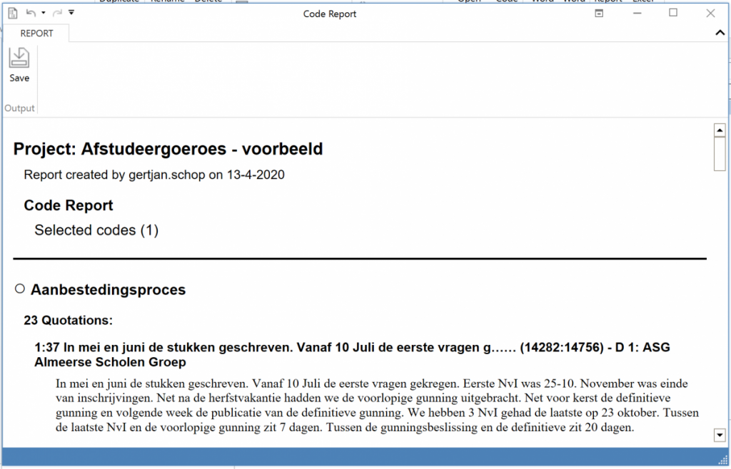 Je kan je report per code of codegroep opslaan als Worddocument. In dit voorbeeld kiezen we voor ‘Aanbestedingsproces’. De reports van de codes of groepscodes nemen we op in de bijlagen ten behoeve van de onderzoekstrail.